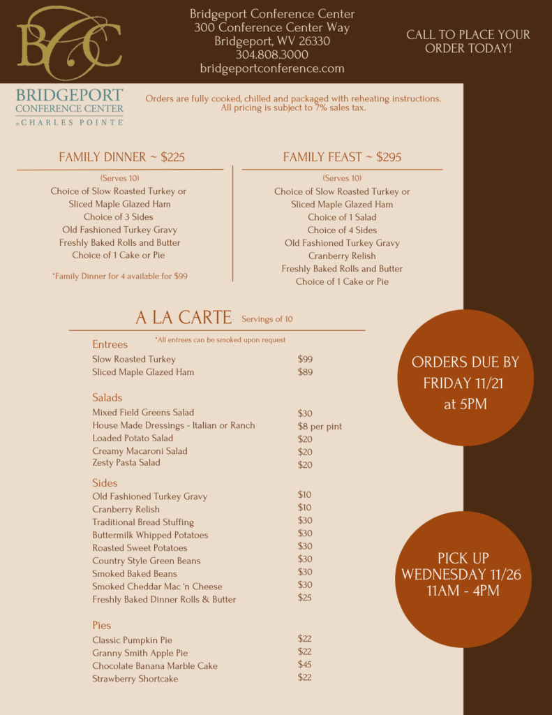 Pick up at Bridgeport Conference Center 300 Conference Center Way Bridgeport WV 26330 304-808-3000 for details